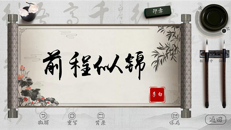1、我們可以通過實物毛筆在卷軸展示的區域進行自由發揮,盡情書寫書法內容。 2、 在書寫的過程中可以通過點解撤銷按鈕將書寫的錯誤筆劃進行撤回的操作。 3、 在書寫過程中如果對自己的書寫內容不滿意則可以點擊重寫按鈕 則可以對已經書寫的整體內容進行消除。 4、 在書寫完成后對于書寫內容的背景可以通過點擊背景按鈕 在左側邊欄彈出的區域內選擇對應的背景圖,通過點擊對應的背景后 稱呼會自動的更換書寫的背景圖。 5、 在書寫完成后 可以通過點擊上面的印章按鈕 對作品進行印章落款。 6、 在書寫完成后 可以通過點擊保存按鈕 則會將書寫的內容進行保存到本地,并自動生成分享的二維碼,可以通過手機掃碼的方式,將內容保存并分享。