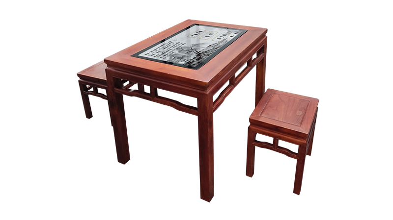 正是基于上述背景,我司開發了一款電子棋桌產品。電子棋桌以一臺可觸摸交互的大屏設備為載體,外觀打造成茶幾造型,并標配椅子,用實木或鈑金材質為主要材料,古色古香,富有文化底蘊。棋桌上運行電子棋軟件,軟件內包含圍棋、象棋、五子棋三套電子棋。