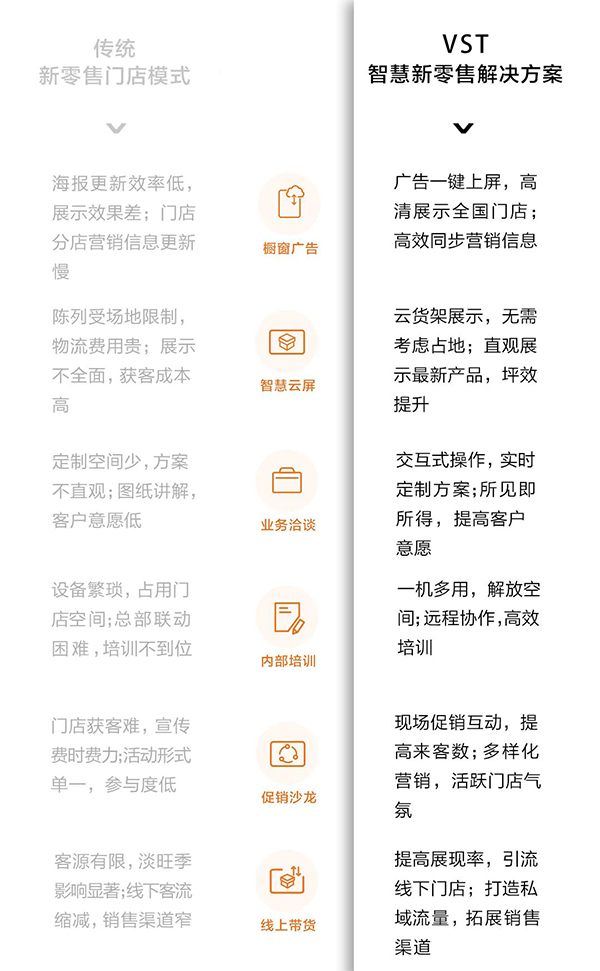 以VST智慧協(xié)同平臺為基礎(chǔ)、整合數(shù)字標(biāo)牌、智慧云屏、信發(fā)系統(tǒng)等VST軟硬件技術(shù),實(shí)現(xiàn)顧客購買全流程智慧化,讓進(jìn)店、逛店、選購、離店和促銷等環(huán)節(jié)形成閉環(huán),提升門店運(yùn)營效率和客戶成交率。傳統(tǒng)新零售門店模式與VST智慧新零售解決方案: