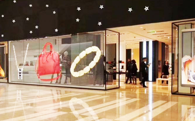 2、半戶外避陰環(huán)境,此類環(huán)境包含寫字樓玻璃幕墻、購物中心、售樓部等等。半戶外避陰環(huán)境對透明屏的亮度要求比純室內應用環(huán)境要高,其亮度選擇應該在3000-5000cd/㎡左右,以保障透明屏幕的正常顯示效果。
