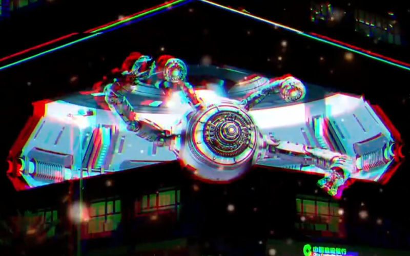 如何讓平面的動圖產(chǎn)生3D效果?只要利用好參照物就可以。我們通過白線將普通圖片分成幾層,然后使動畫部分能夠“突破”白線,覆蓋掉圖層的其他要素,即可利用眼睛的視差而形成3D的假象。僅僅這樣還不夠,大家有沒有發(fā)現(xiàn),近期爆紅的3D屏無一例外都是由兩個不同角度的面組成。顯示屏將畫面折疊90°,利用符合透視原理的視頻素材,左側(cè)屏展示圖像的左視圖,右側(cè)屏展示圖像的主視圖,當(dāng)人站在轉(zhuǎn)角的前方觀看時,便同時看到物體的側(cè)面和正面,呈現(xiàn)逼真的立體效果。