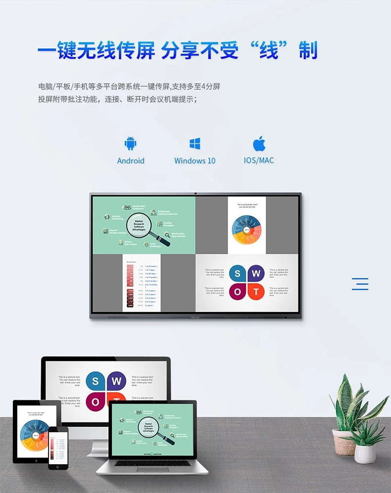 智能會議一體機集成了電腦、電視、音響等多設備功能于一體,配備了電子白板書寫、無線投屏、智能批注、遠程會議等多種會議常用工具,可以流暢播放ppt、word、excel、flash等文件,還配置了落地式移動支架,方便隨時移動。
