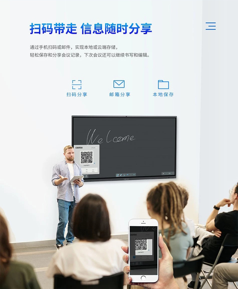 硬件設備自帶高清攝像頭,內置安裝了遠程視頻會議系統,可以方便實現視頻音頻交流,加上書寫黑板共享功能,方便參會人員互動交流,就如同面對面開會一樣。使用具有高度人機交互功能的智能會議一體機,不僅僅能給人一種非常高大上的感覺,在會議作用上可以充分調動參會人員的熱情和溝通欲望,從而提高會議效率,提高會議質量。